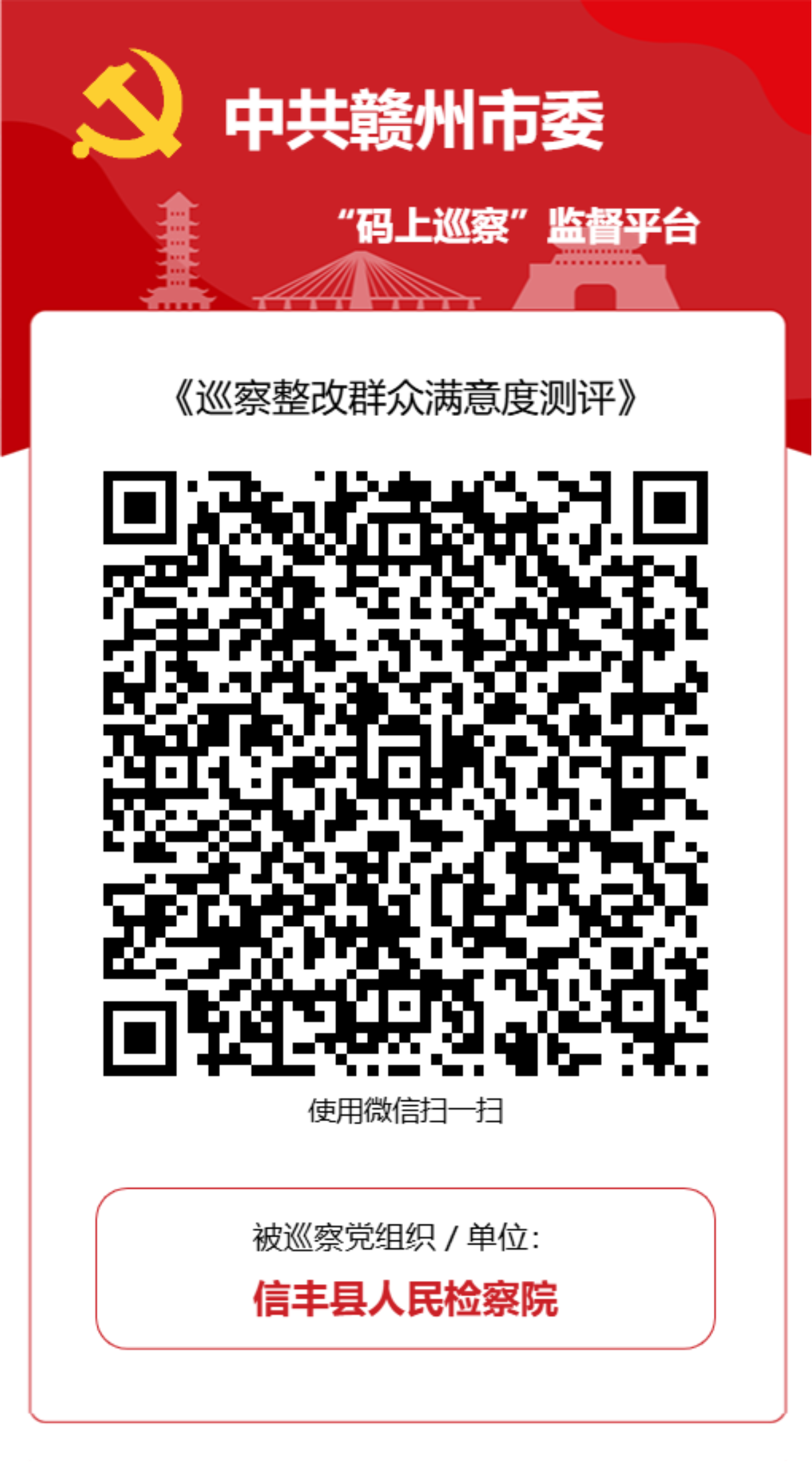 欢迎广大干部群众对巡察整改进展情况进行监督。如有意见建议,请及时向我们反馈。联系电话07973329910;邮箱地址:江西省赣州市信丰县阳明北路151号信丰县人民检察院政治部,邮编341600;电子邮箱:J362123@126.com。